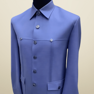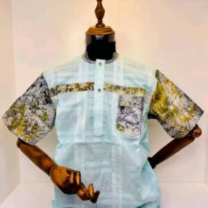 A stylish short-sleeve men's shirt crafted in light aqua fabric, highlighted with bold African print details on the sleeves, chest pocket, and across the upper chest. Featuring a round neck with a button placket and decorative pocket flap, this design blends contemporary tailoring with vibrant traditional patterns, making it perfect