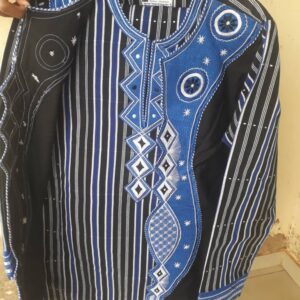 A handwoven African smock featuring bold black-and-white stripes, beautifully adorned with intricate blue and white embroidery in geometric and star patterns. This traditional attire, commonly worn in West Africa, blends cultural heritage with striking craftsmanship, making it ideal for ceremonies, cultural events, and special occasions.