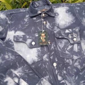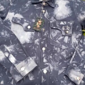 This is a men's denim jacket or utility shirt featuring a unique tie-dye or acid-wash pattern in shades of dark indigo and faded gray. It has a classic button-down front with two symmetrical chest pockets, each secured with a button. The garment's design blends a rugged, workwear style with a