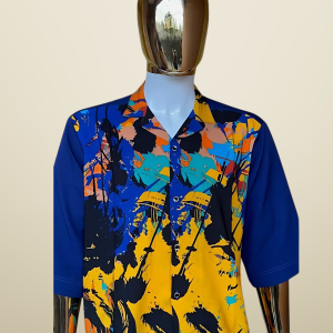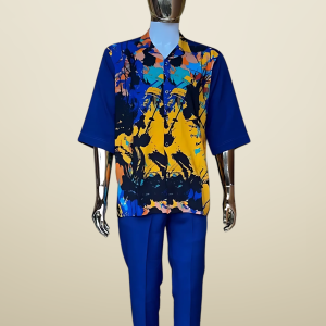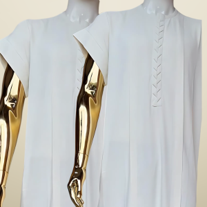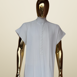 A refined black senator-style outfit, featuring short sleeves and a clean, tailored fit. The look is elevated by intricate, understated embroidery detailing along the front, adding a touch of cultural sophistication and modern elegance.