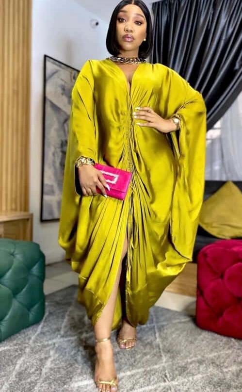 A luxurious chartreuse silk kaftan with dramatic batwing sleeves and a ruched center draw, effortlessly sculpting the silhouette. Its fluid drape and bold color radiate opulence, making it the ultimate statement piece for high-end soirées and red-carpet entrances.