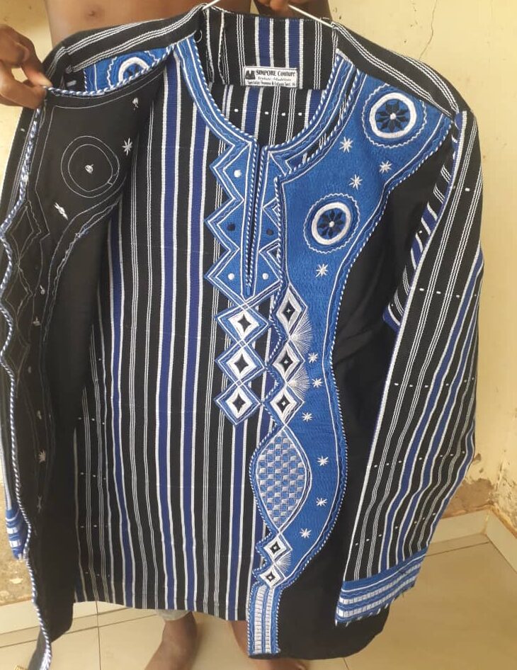 A handwoven African smock featuring bold black-and-white stripes, beautifully adorned with intricate blue and white embroidery in geometric and star patterns. This traditional attire, commonly worn in West Africa, blends cultural heritage with striking craftsmanship, making it ideal for ceremonies, cultural events, and special occasions.